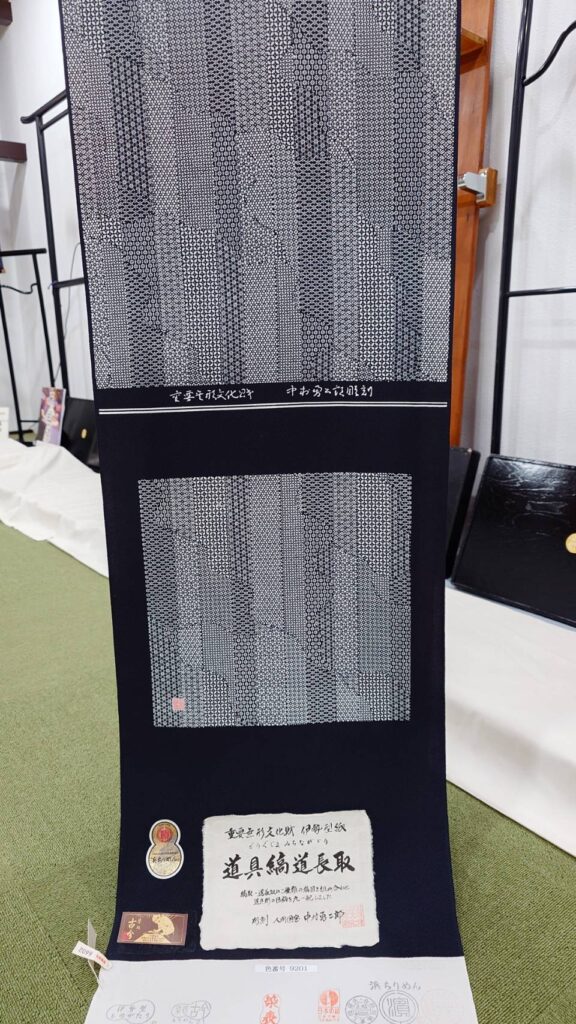伊勢型小紋は、故・人間国宝中村勇二郎氏の手によるもの。